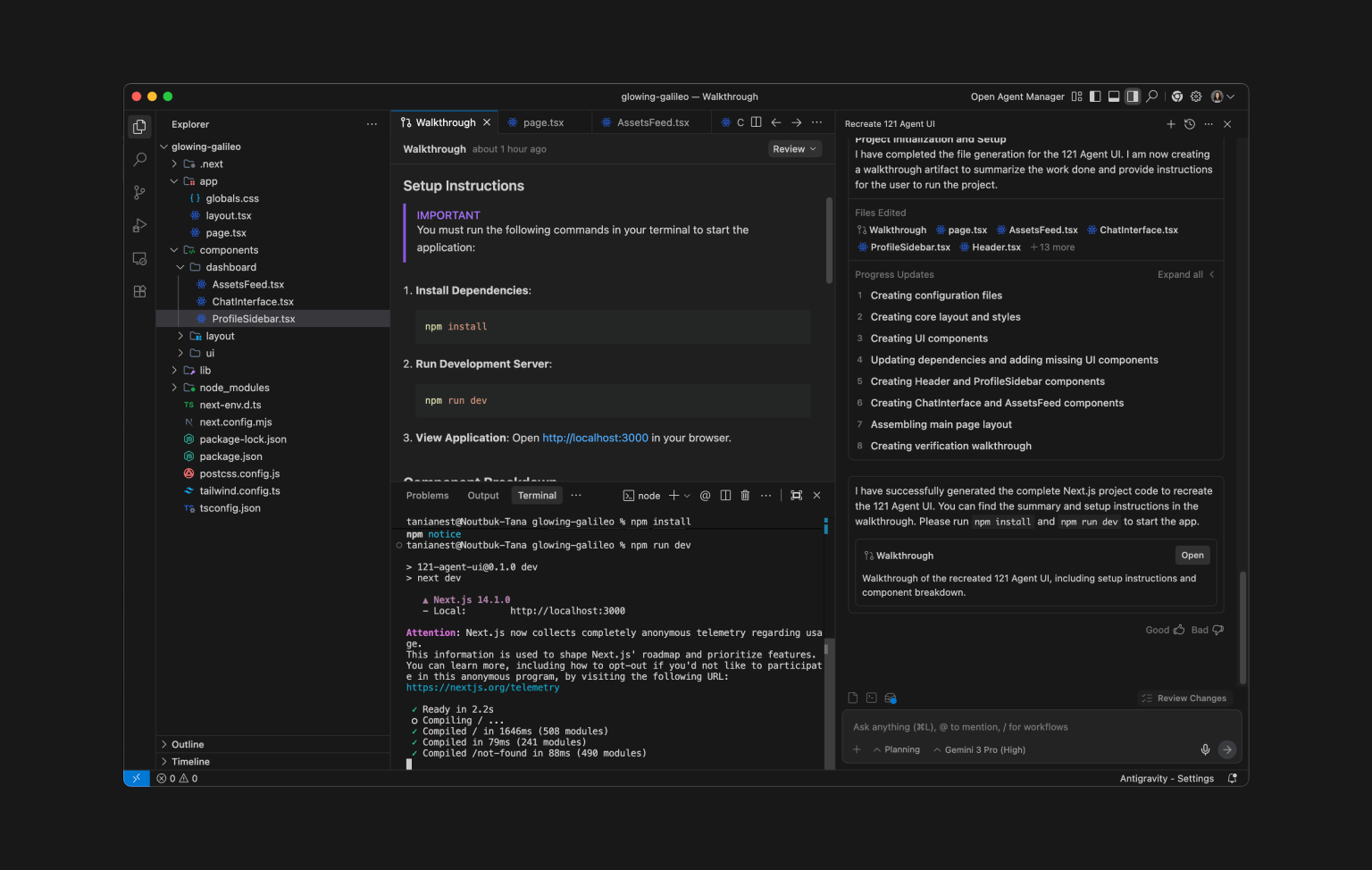 In Antigravity's terminal set up npm server and type "run" to launch it. This will run a local server on your computer and you can access your designs localhost:3000 from your browser.